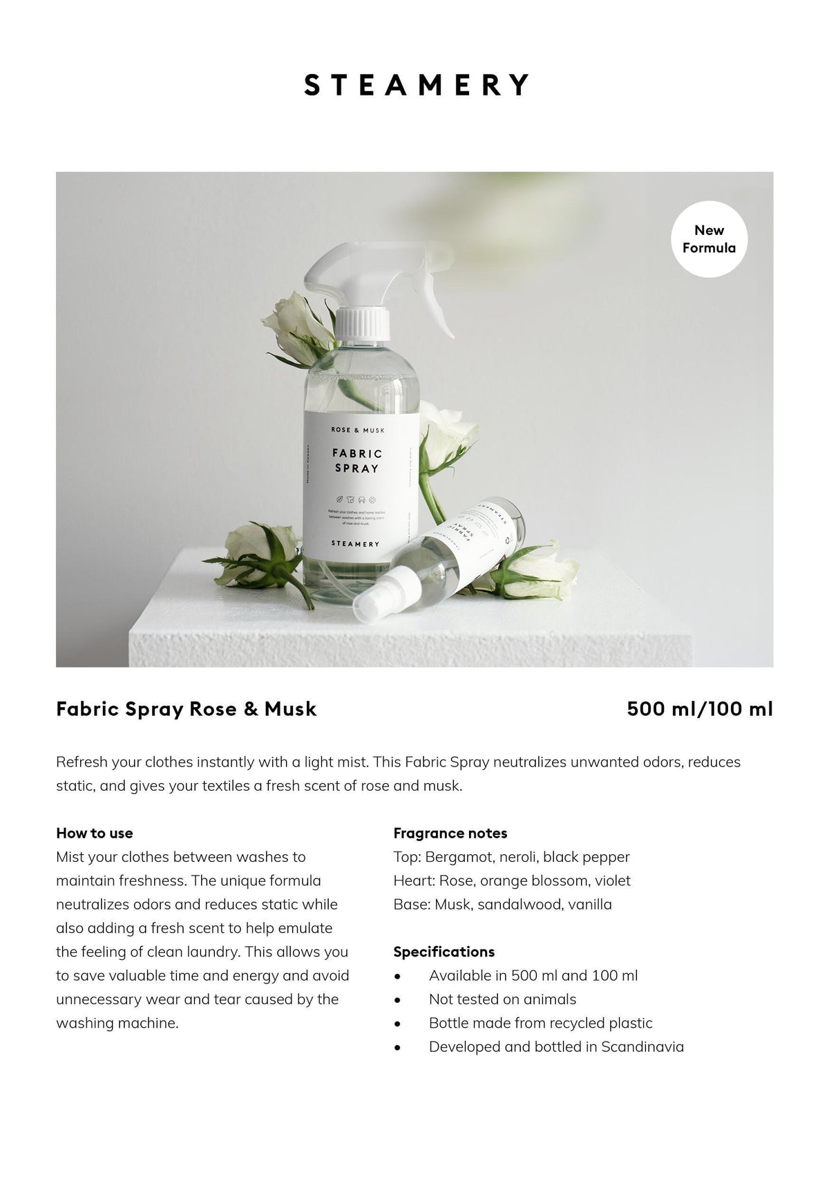 Refresh your clothes between washes with a light mist. Our Fabric Spray neutralizes unwanted odors, reduces static electricity and gives your textiles a fresh scent of rose and musk.