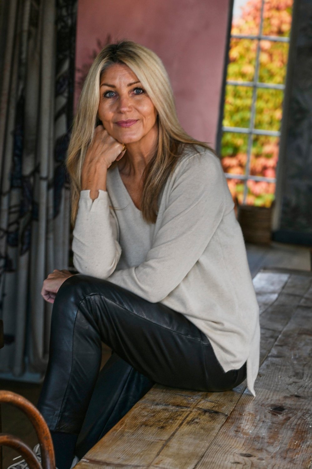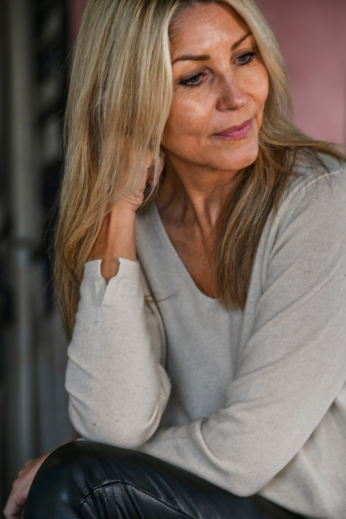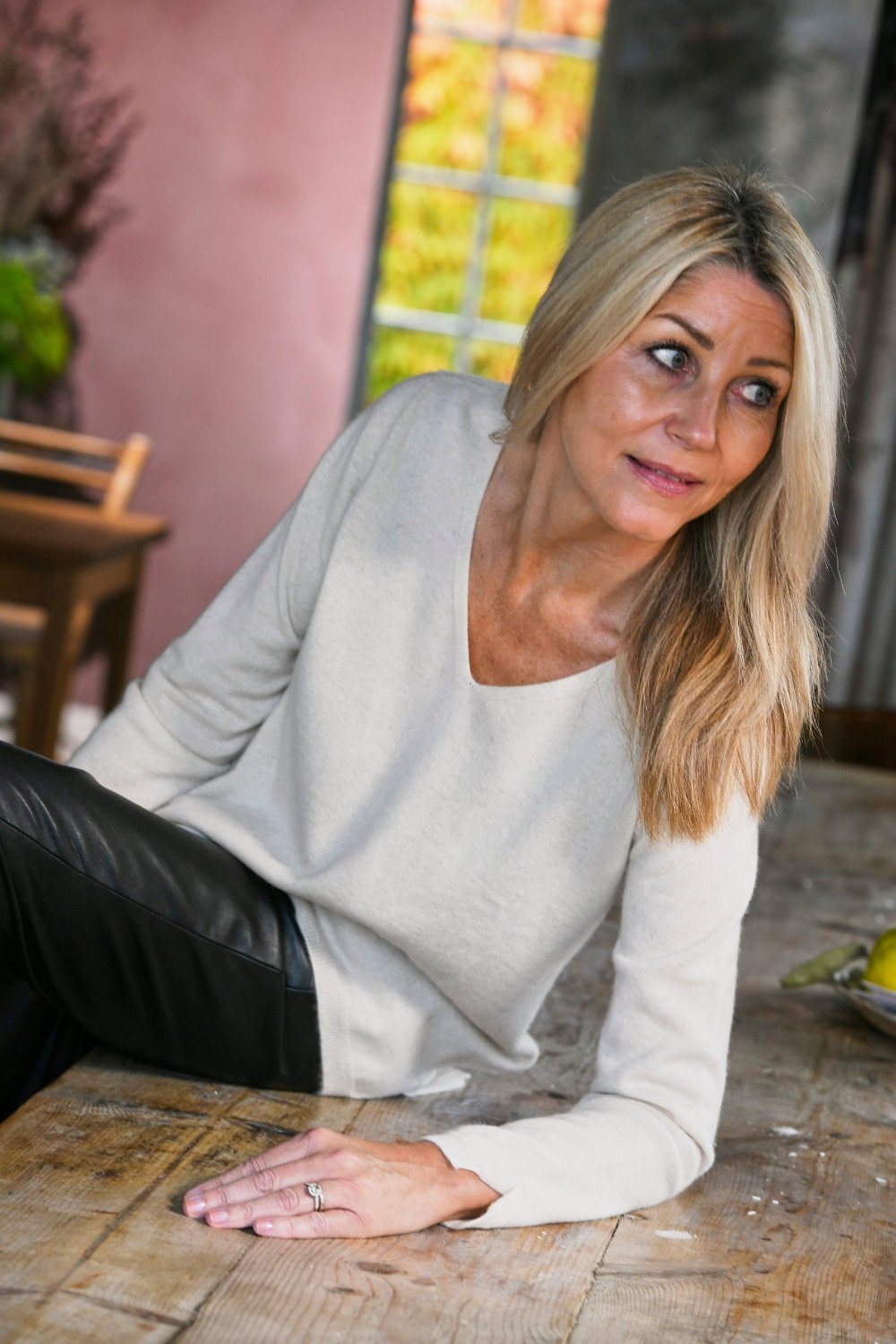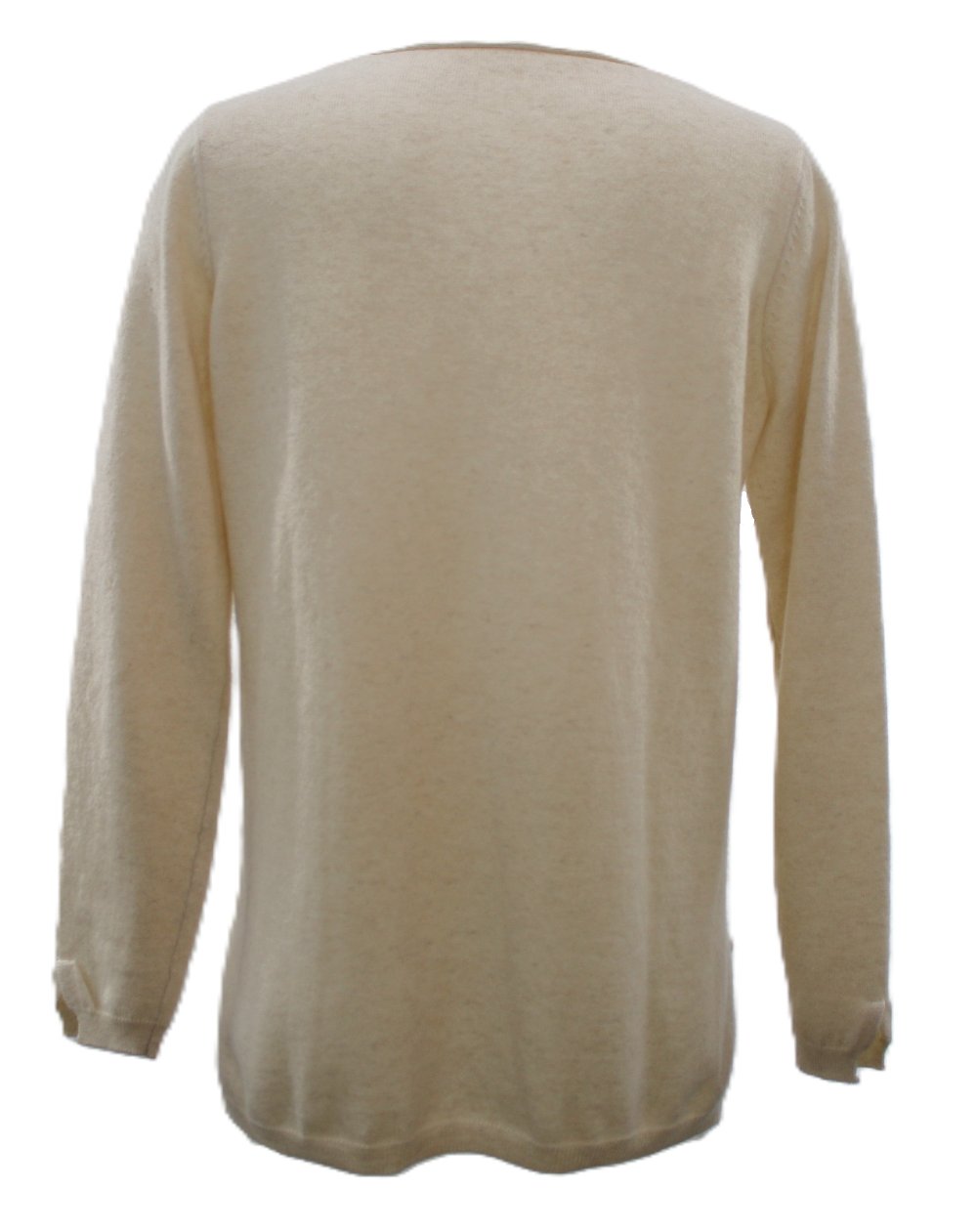 Long-sleeved knit in 100% Cashmere with V-neck, small slit on the sleeves and at the bottom of the sides.
